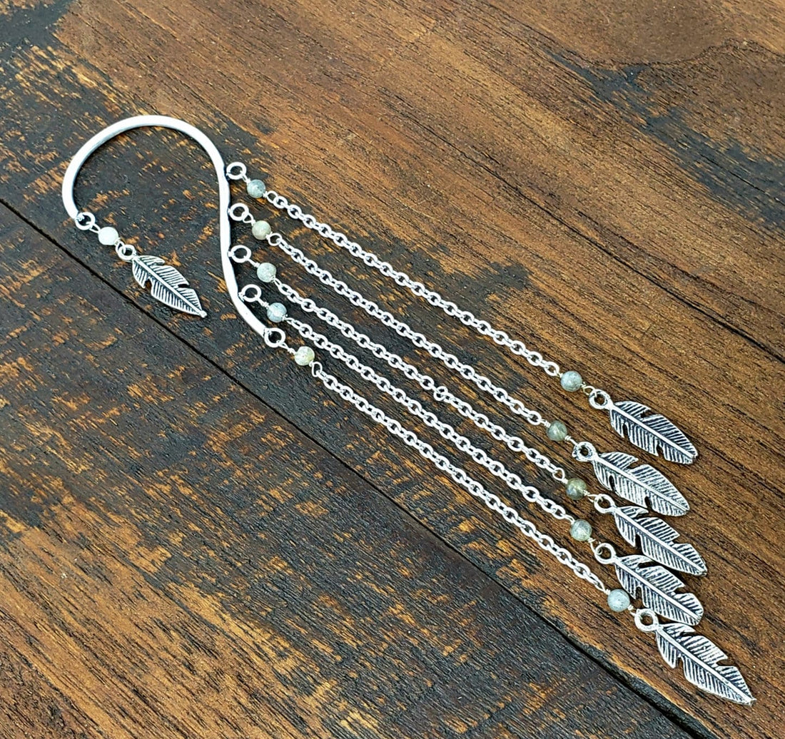 Silver Chain Ear Cuff with Labradorite Beads and Feather Charms
