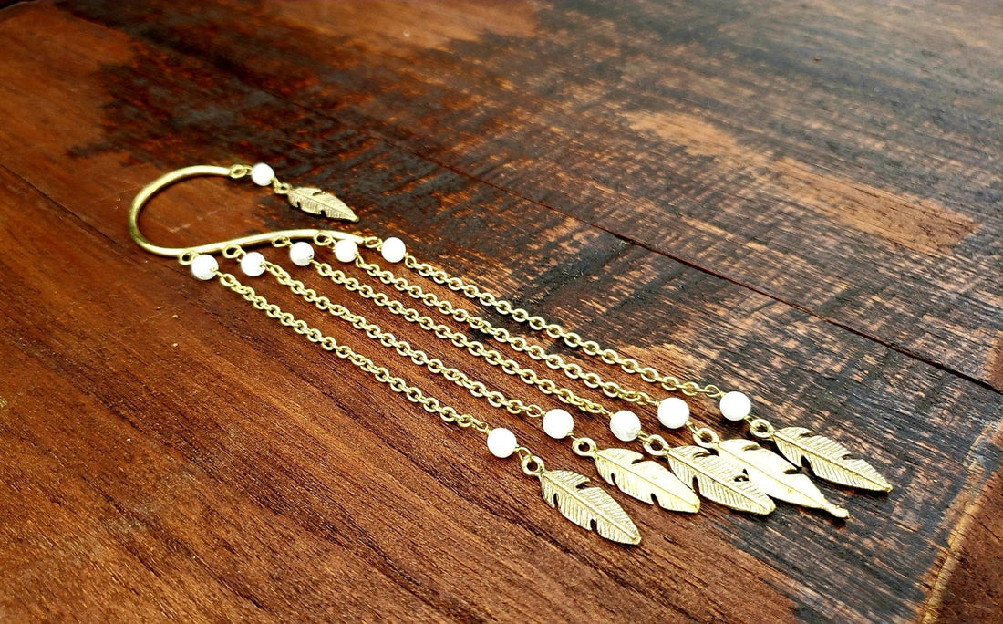 Gold Chain Ear Cuff with Turquoise Beads and Feather Charms