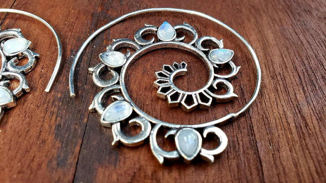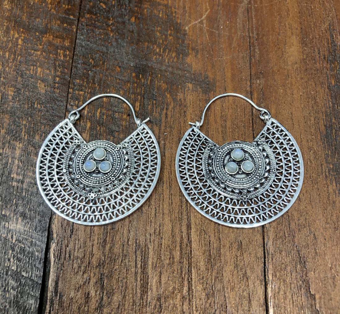 Silver Mandala Rainbow Moonstone Gypsy Tribal Unique Unusual Earrings