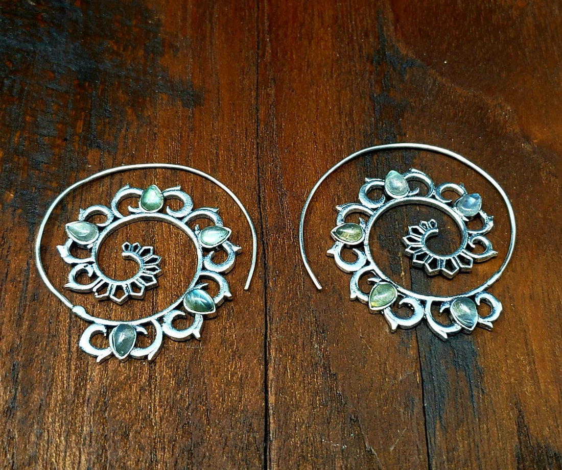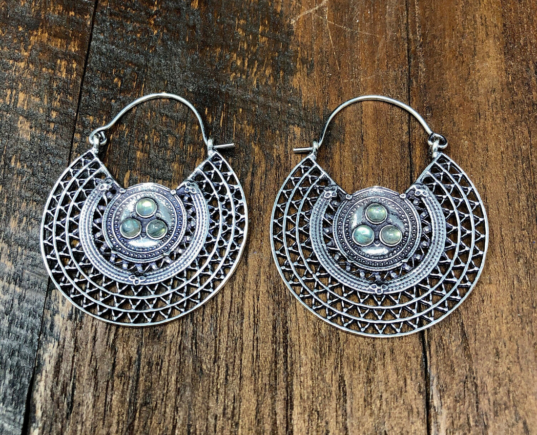Silver Mandala Labradorite Boho Tribal Unique Unusual Earrings