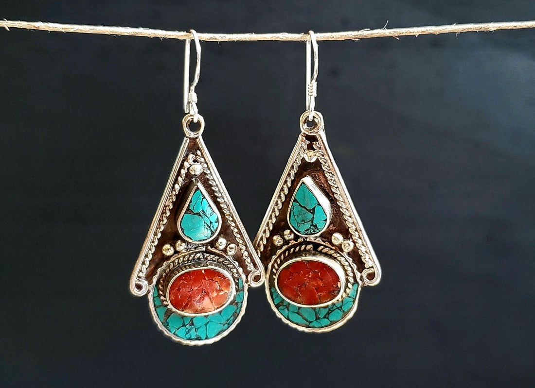 Turquoise and Coral Tibetan Earrings