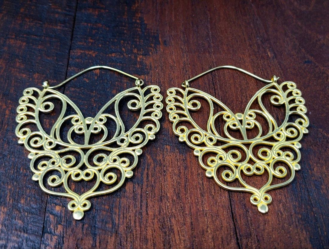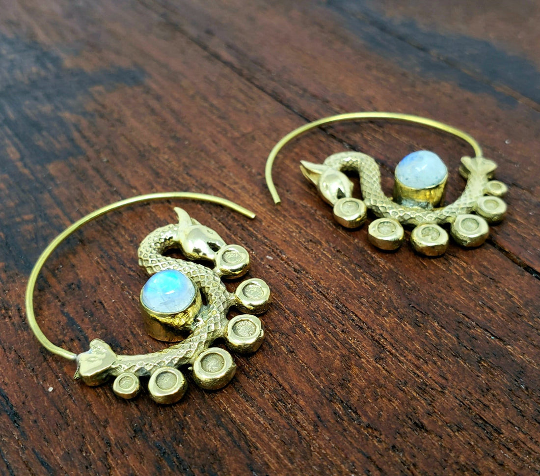 Gold Moonstone Shield Earrings - Bohemian Boho Brass Jewelry