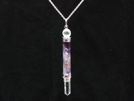 On the top and bottom of the piece are clear quartz crystals. Quartz is believed to broadcast energy. It is well placed on this pendant to broadcast the powerful healing properties of these chakra crystals across your mind, body and spirit.